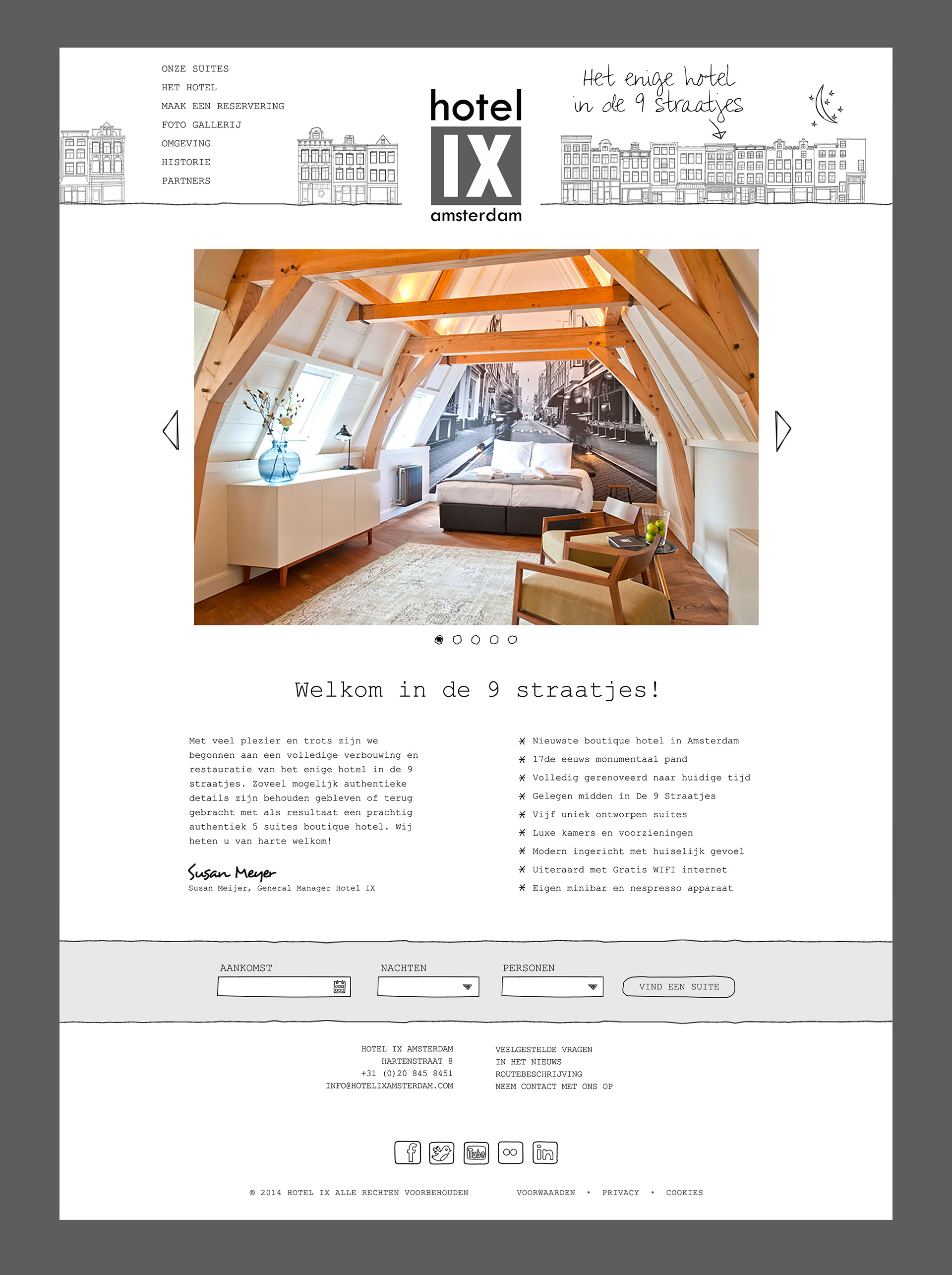 I designed and built a website for Hotel IX, a new hotel in Amsterdam, the Netherlands. I created the logo, hand-drawn illustrations, and several branding materials, including stationary, an area map and welcome book for each room with information about the historic building and area.